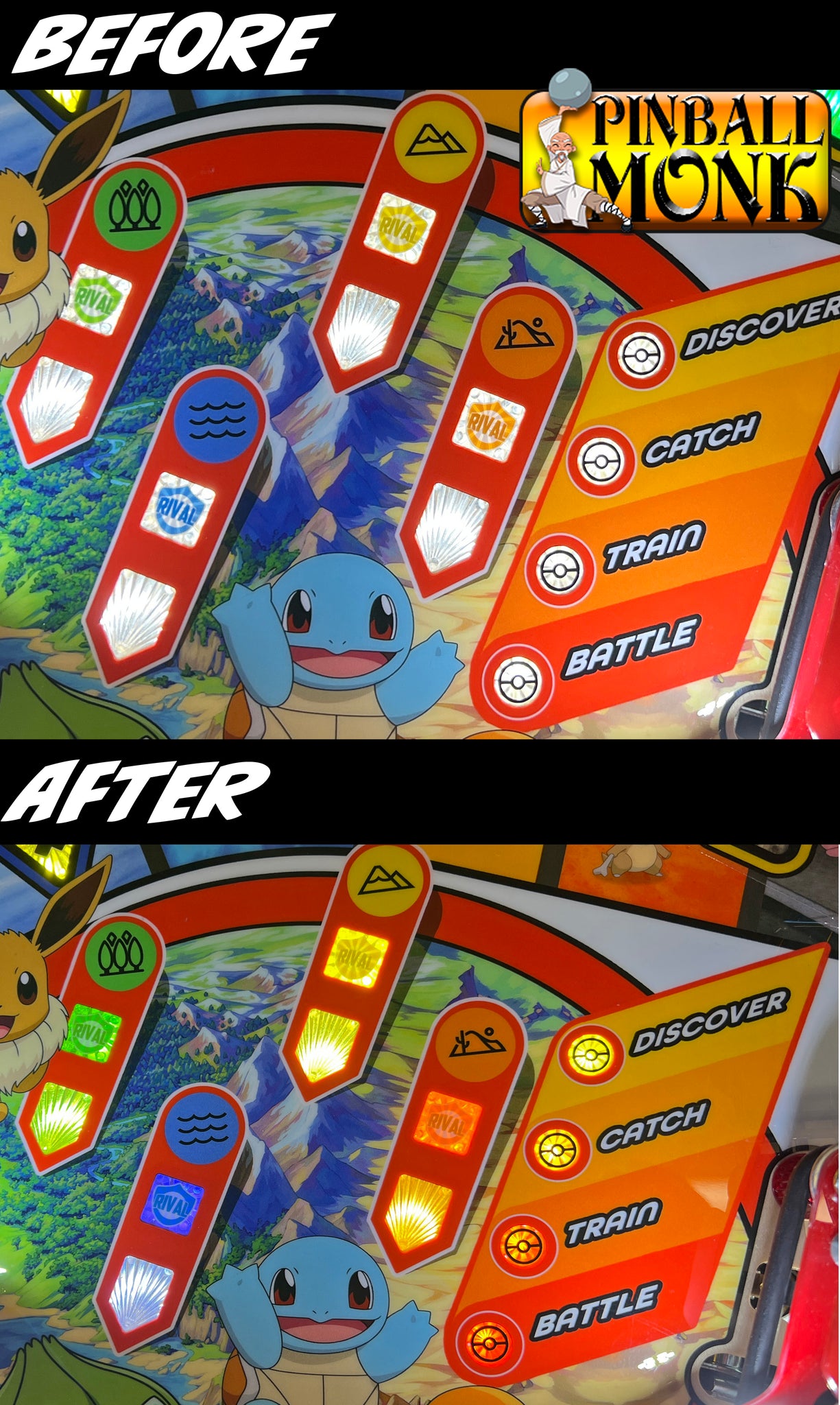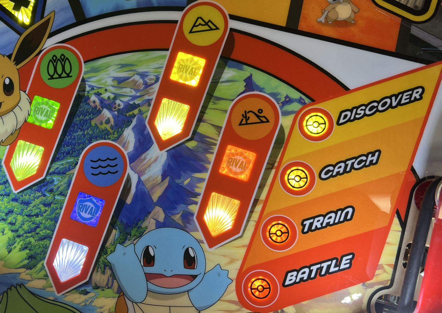 This bracket brings playfield-matching color to the 12 center inserts of the Pokemon pinball machine. Each of the regions has a light and dark version of its color, and the capture progression on the right is a gradient from dark yellow to dark orange, just like the playfield art next to it.