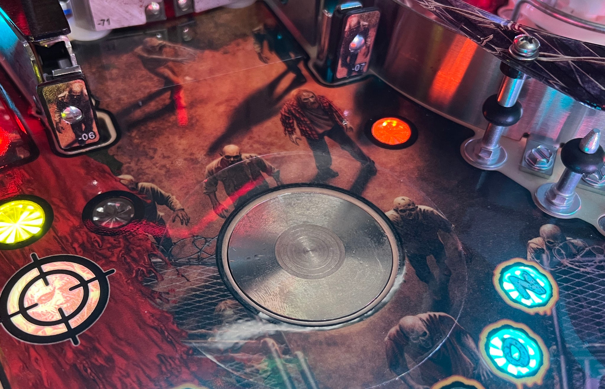 - The exposed sticky part of the mylar should hover slightly above the playfield from the fold thickness, allowing you to test alignment first using the target slot as a visual alignment point. You want the center hole in the mylar centered over the magnet pad on the playfield.